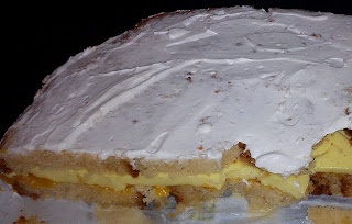 Cozinhar o pudim seguindo as instruções do pacote e deitá-lo ainda quente sobre as camadas de bolo e pêssego. Deixar arrefecer.